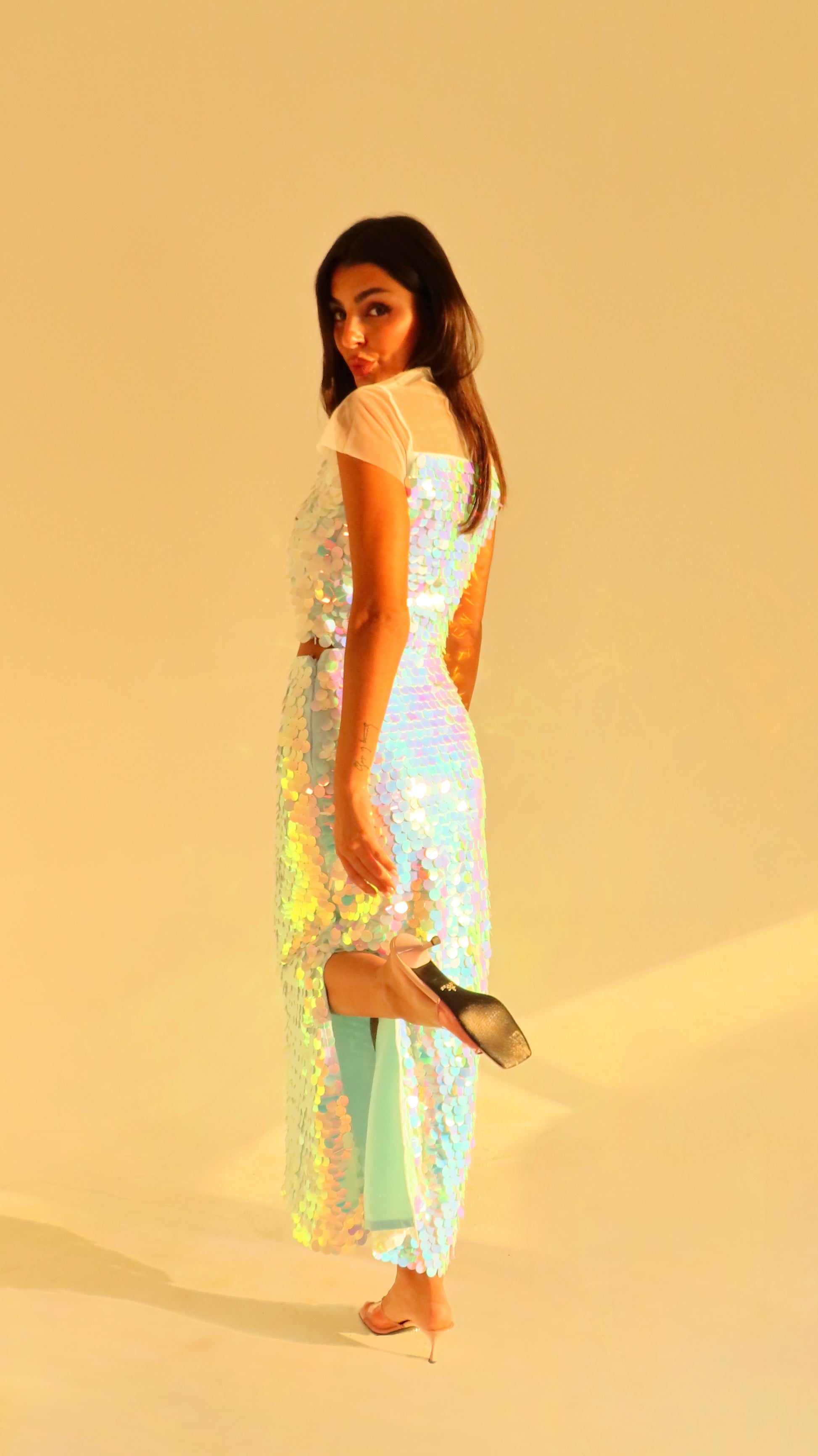 Adazzling skirt handcrafted with oversized sequins that is iridcent in color. High waister skirt featuring a side slit for graceful movement.