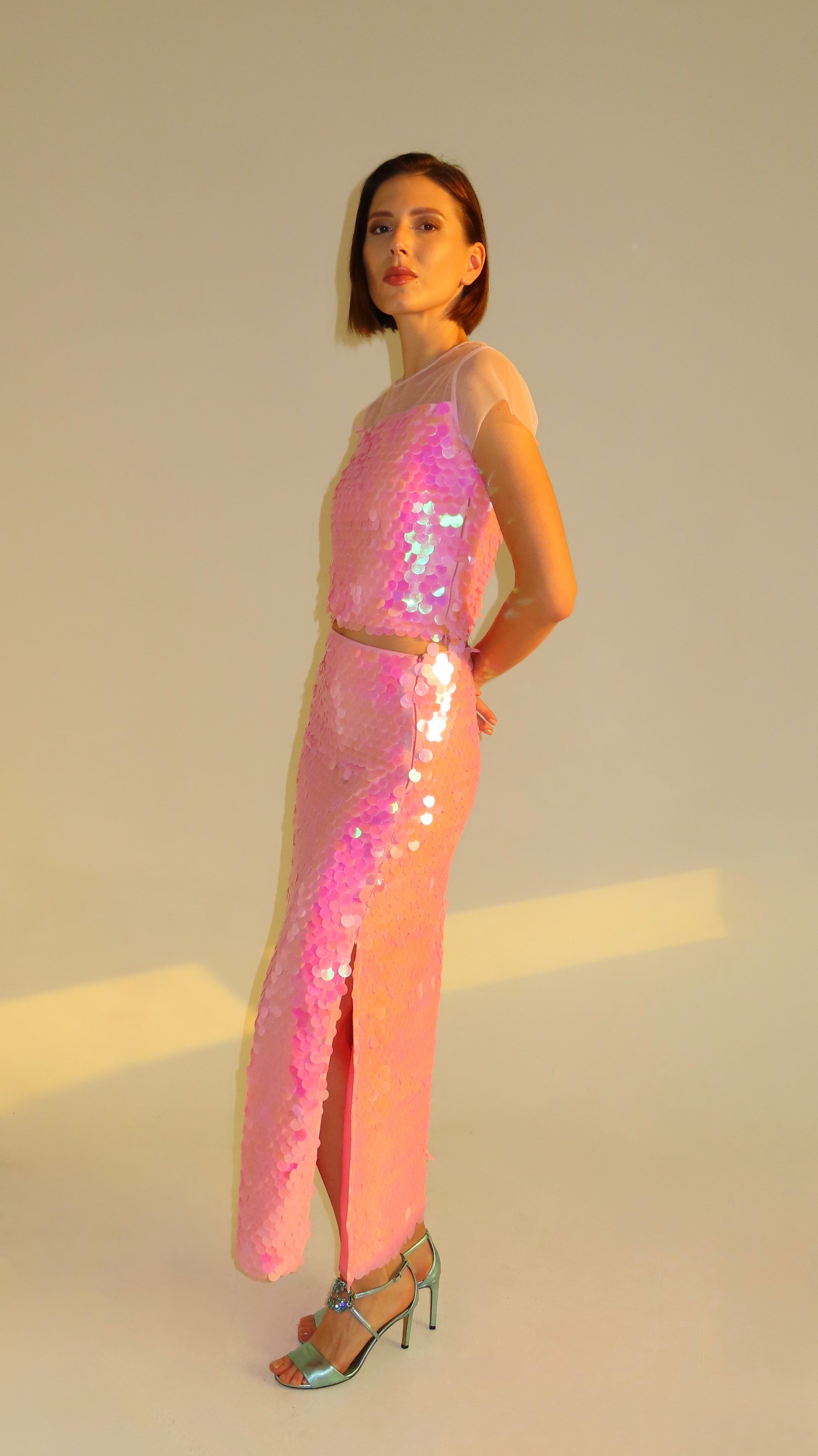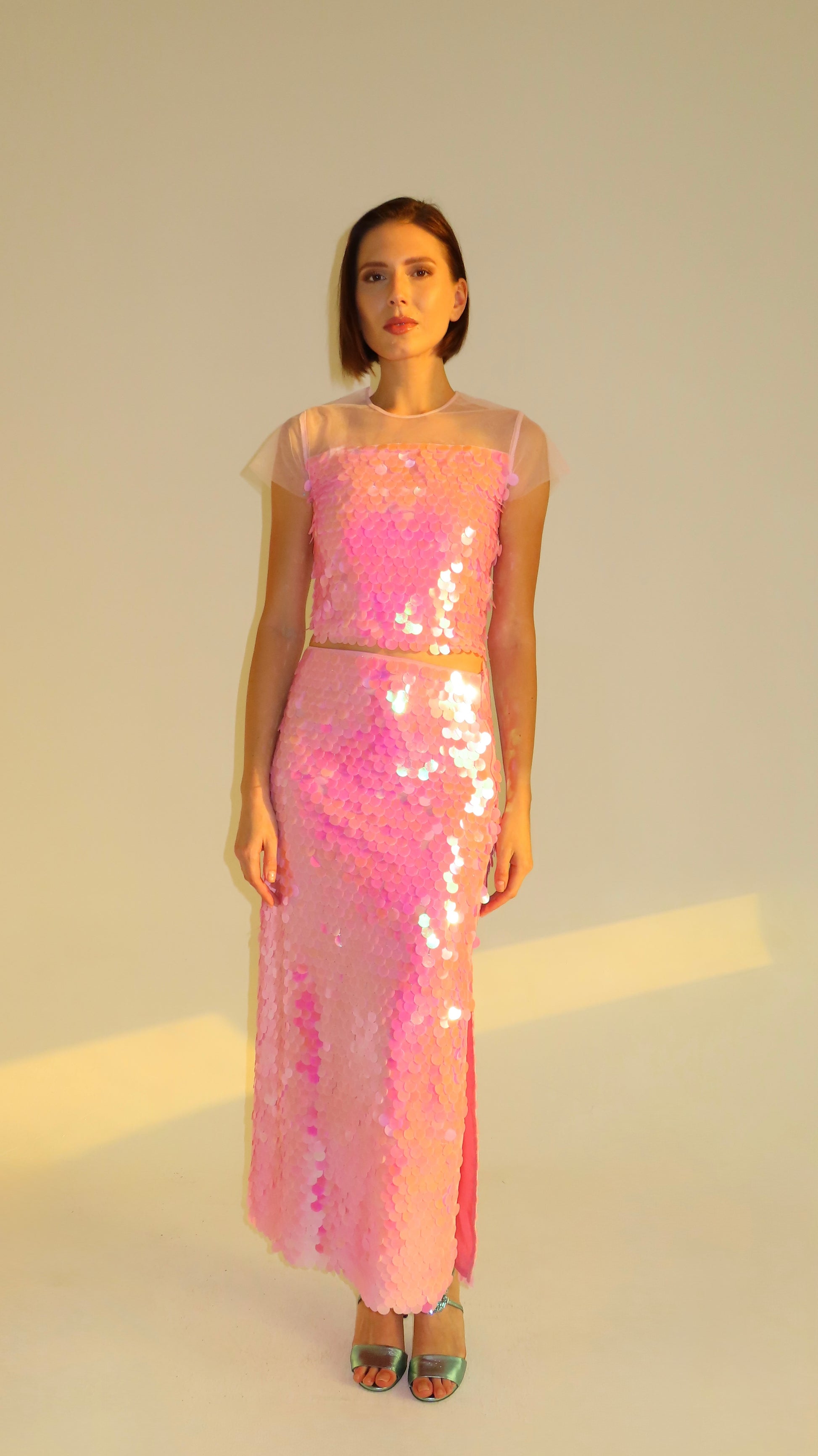 Adazzling top handcrafted with oversized sequins that is pink in color. A cropped top with sheer tulle shoulders.