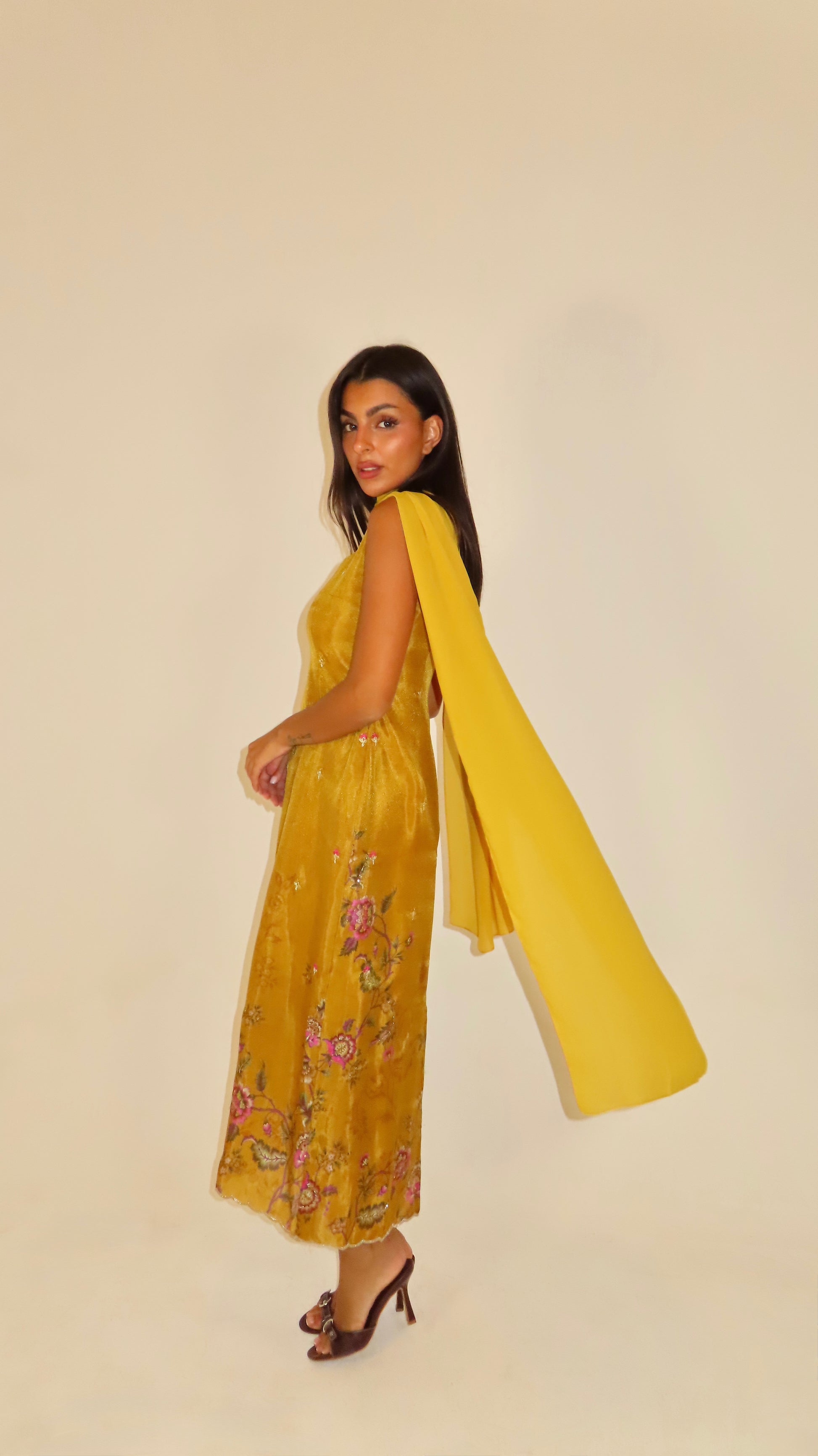 Golden tumeric medi silk dupatta with delicate floral embroidery and flowing chiffon shal. Elegance with a square neck line and slit at the back.