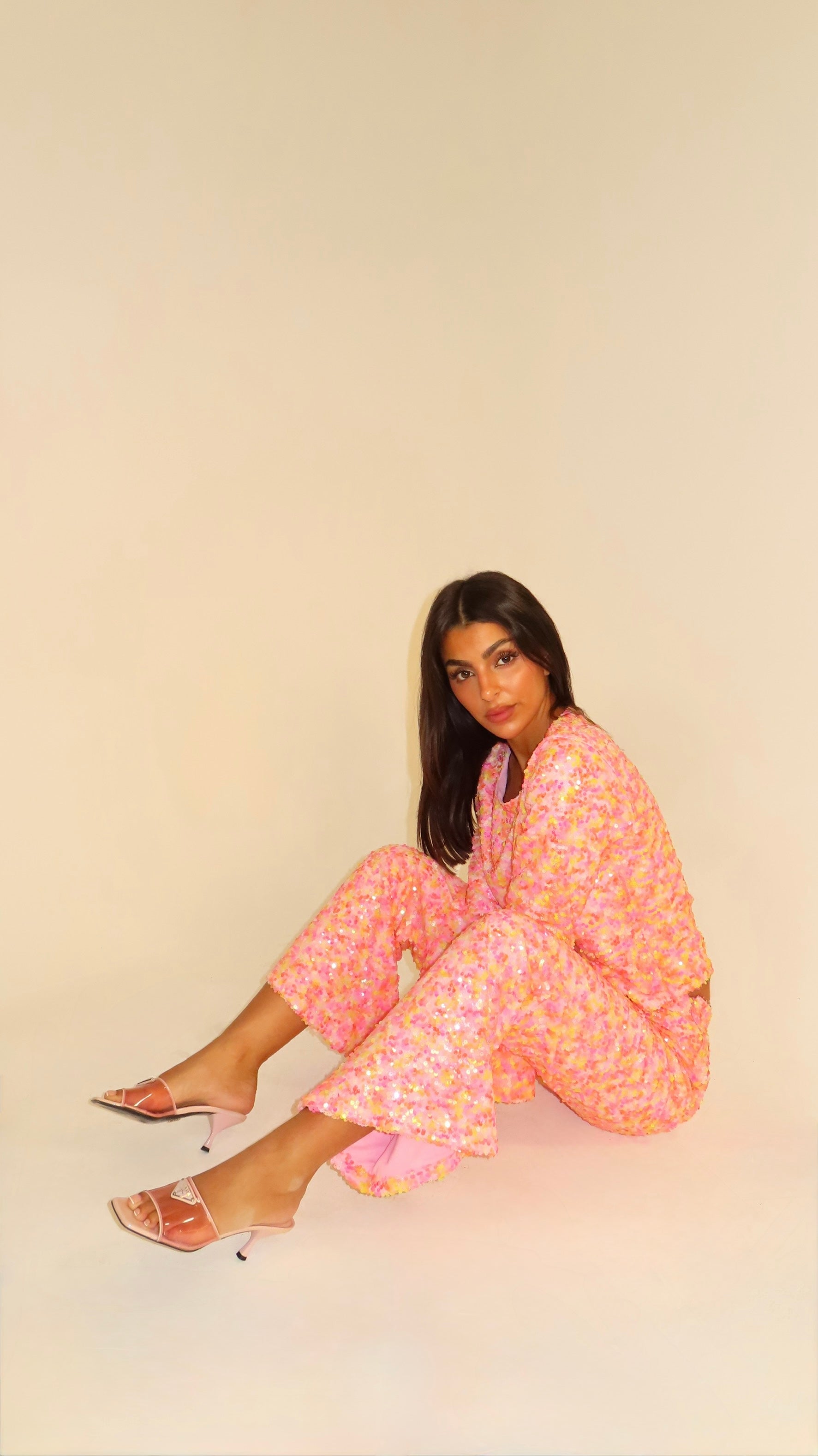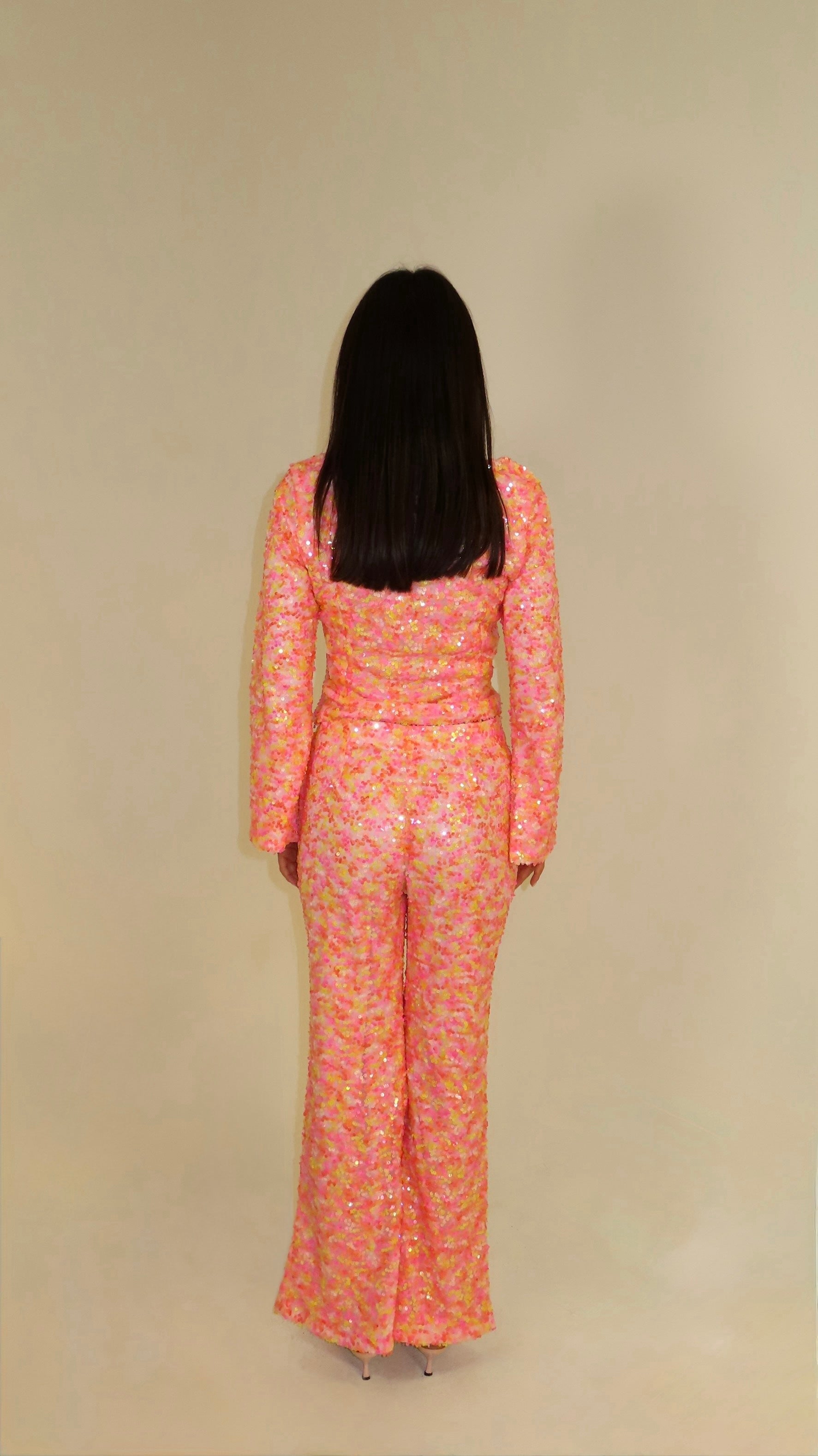 Playful blush pinks and yellows sequins top with flared sleeves and a fitted waistline.
